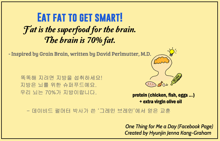 The biggest change in my life since I started One Thing for Me a Day is that I have become conscious of what I do and eat every day. I already learned that a high-carb diet causes weight gain. However, changing a diet is obviously not easy. To motivate myself to change, I turn to reading because knowledge fuels change. Dr. David Perlmutter, a renowned neurologist, explains the damaging impact of carbs on the brain.